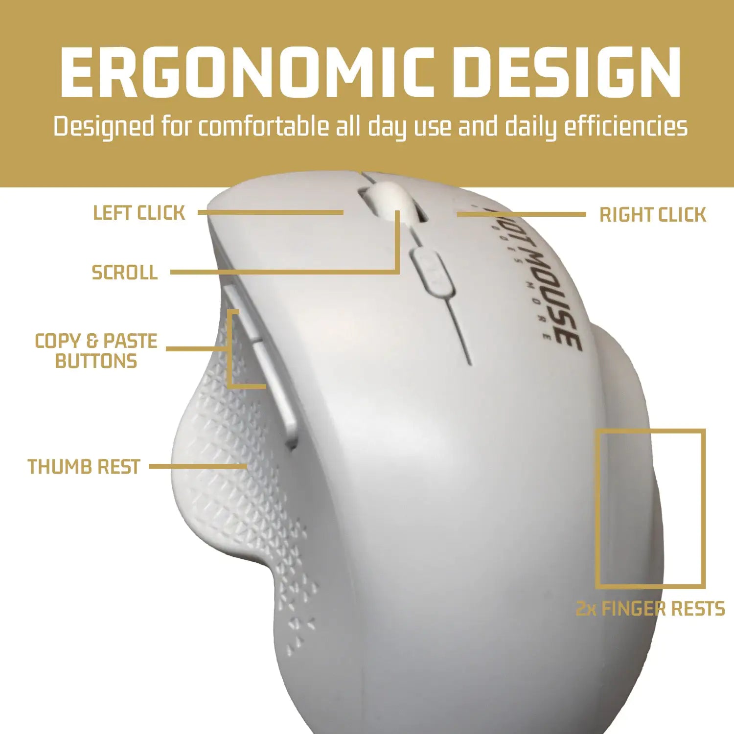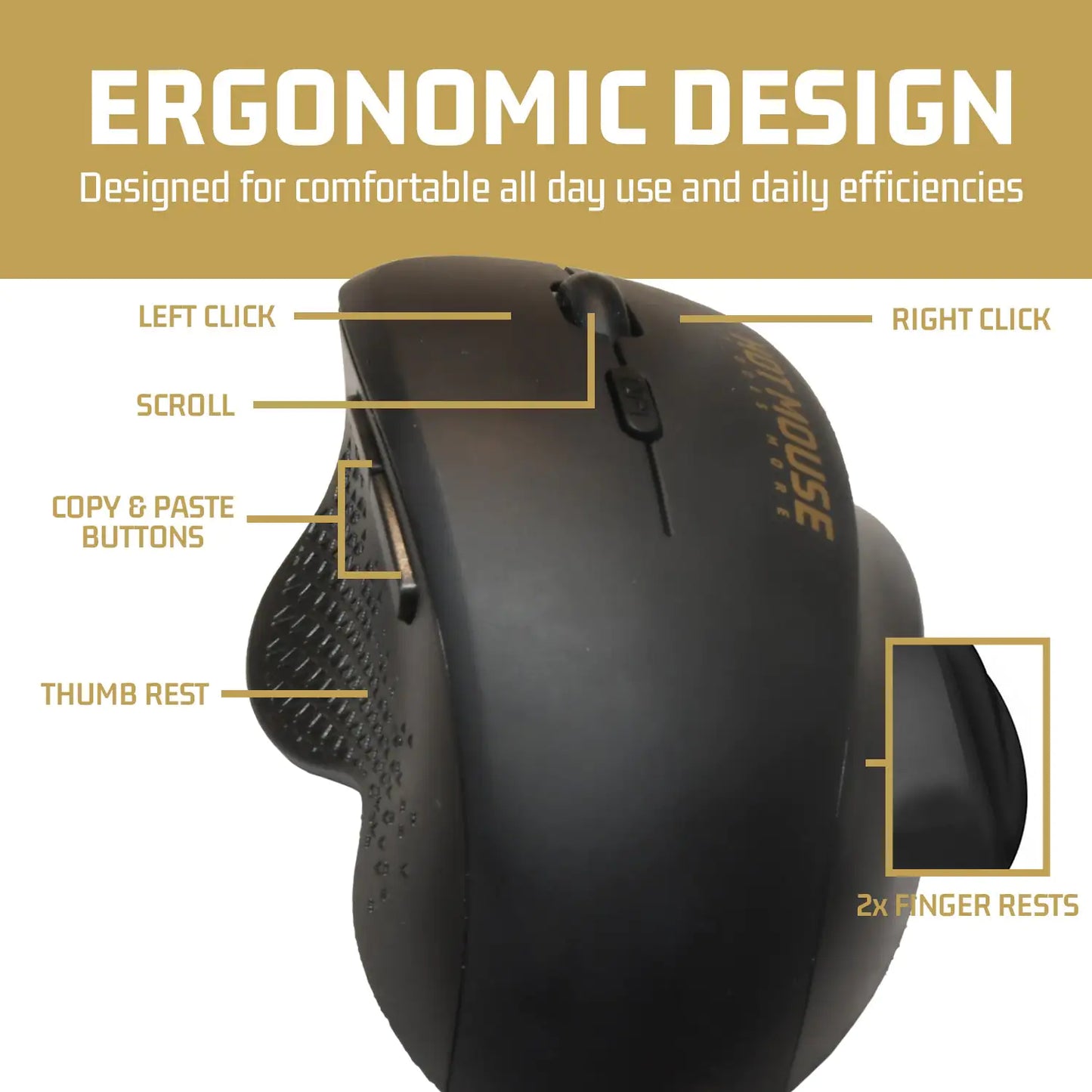 Este mouse también es extremadamente cómodo de usar, con un apoyo para el pulgar y dos dedos, toda la mano está sobre el mouse.