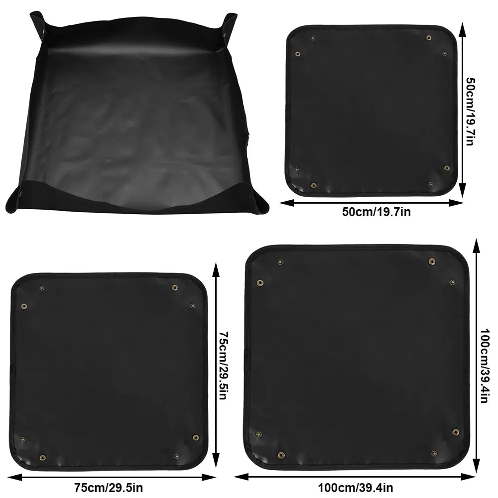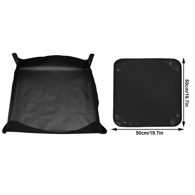 Crafted from durable PE material, this mat ensures long-lasting performance and reliability. Its innovative design features two copper buckles at each corner, securely locking in water and soil to prevent leaks and spills.