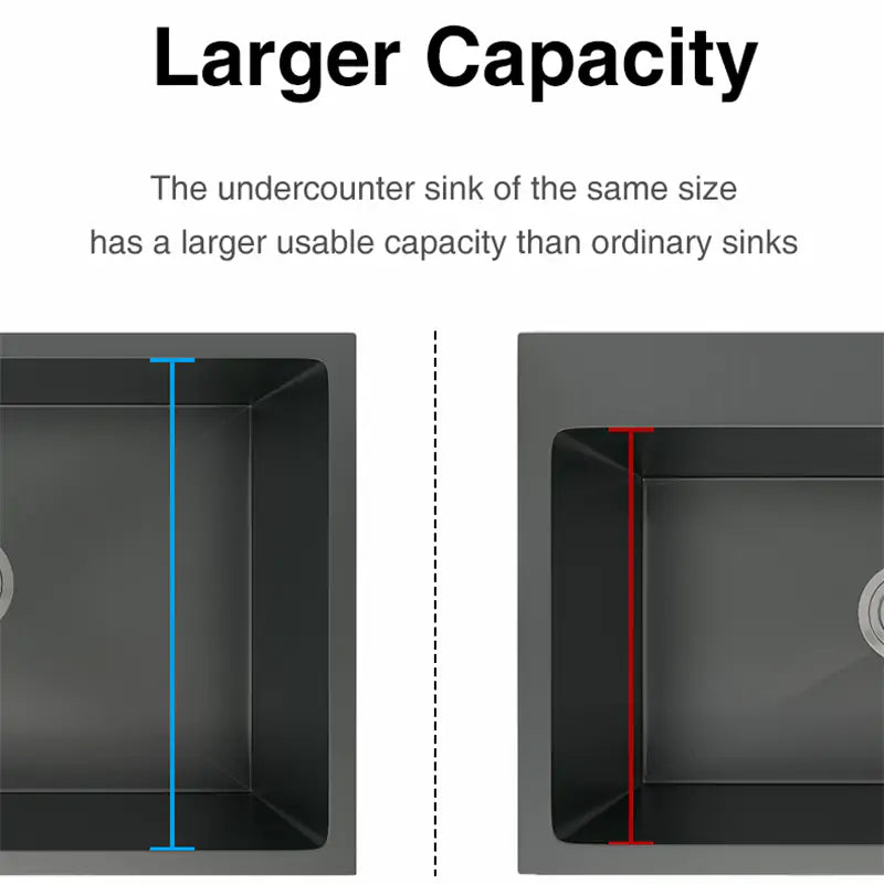 Designed for convenience, the sink features a rear-set drain and engineered grooves that facilitate complete water drainage, preventing water from pooling and ensuring a clean, dry sink after use. The extra-thick rubber sound dampening pads cover 80% of the sink base, effectively absorbing noise and vibration for a quieter kitchen environment.